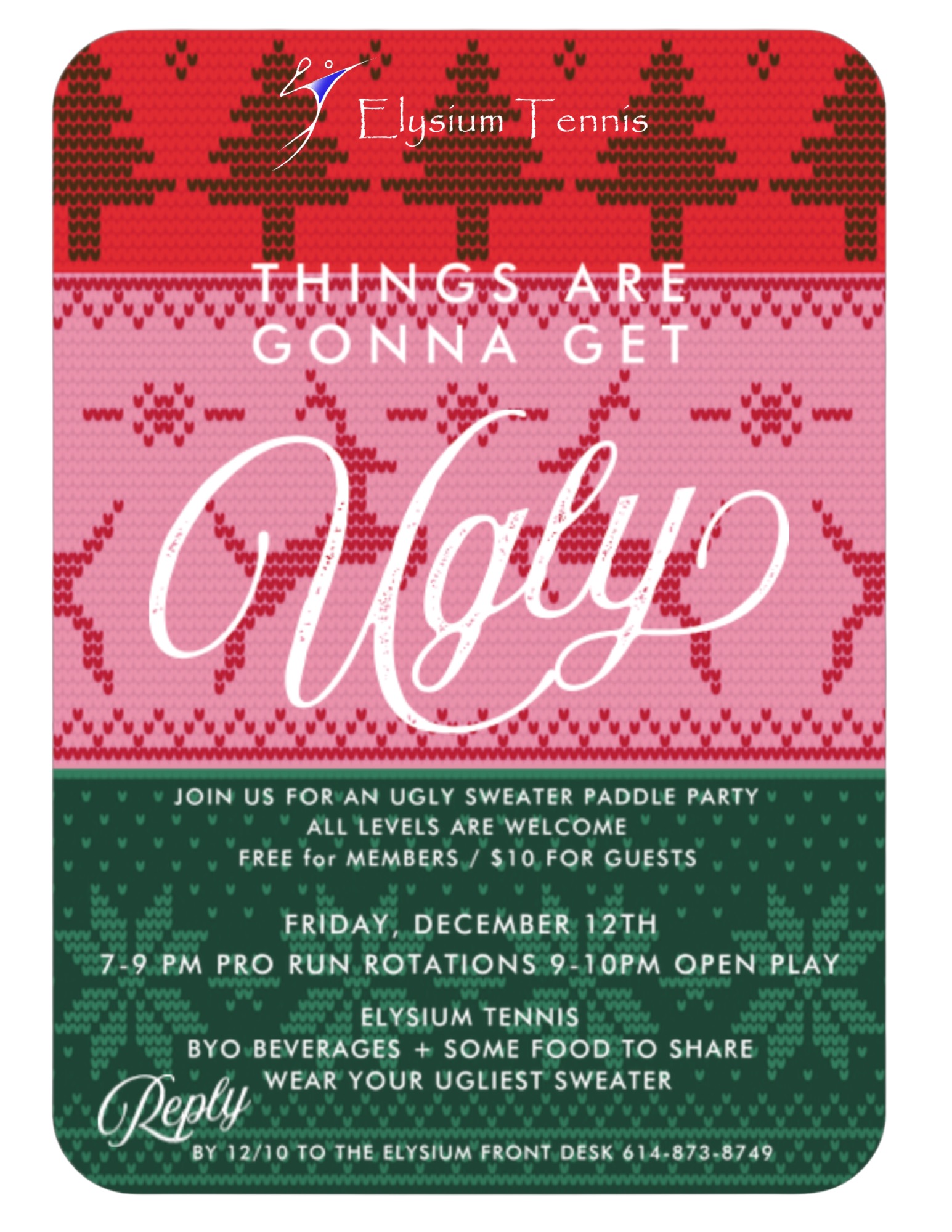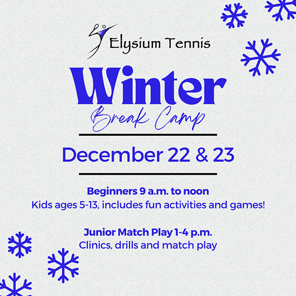Join Elysium Tennis players and guests at the Winter Break Camp on December 22 and 23. Beginners will enjoy fun activities and games from 9 a.m. to noon. Kids in our Junior Select, Competitive Prep, Developmental, Middle/High School, Junior Academy and Challenger programs (or a similar level) will engage in clinic-style drills and match play from 1-4 p.m. The cost is $40 for members and $50 for non-members per day. Use the registration links below or contact us at 614-873-8749.